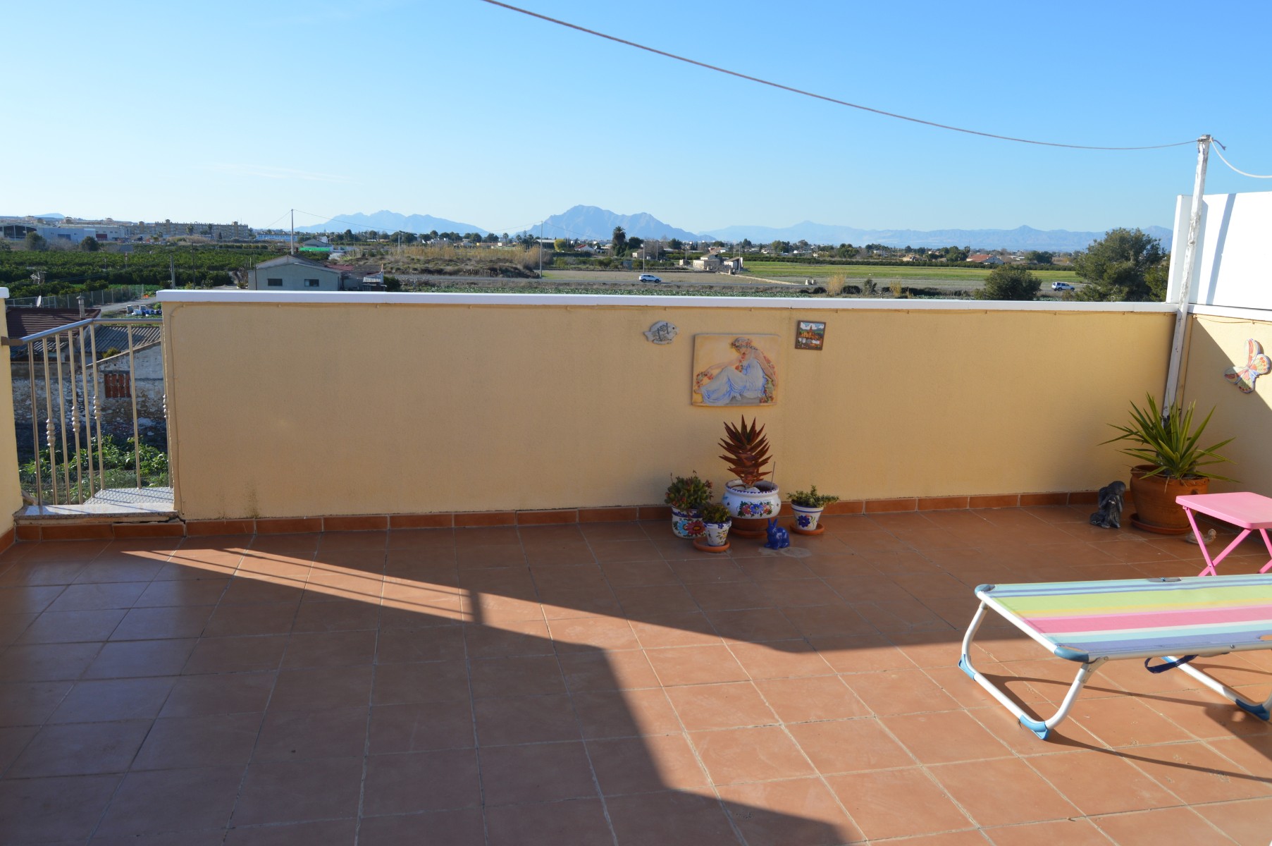 This lovely sunny top floor apartment in Los Palacios, Rojales is accesed by a private staircase into a cozy porch with gate , upon entrance to the property there is a bright open plan living space with lots of light that opens onto a gorgeous terrace with uninterrupted views over the countryside and mountains with spiral stairs to the 32m2 well mainted private solarium that shares the same amazing views as the terrace.