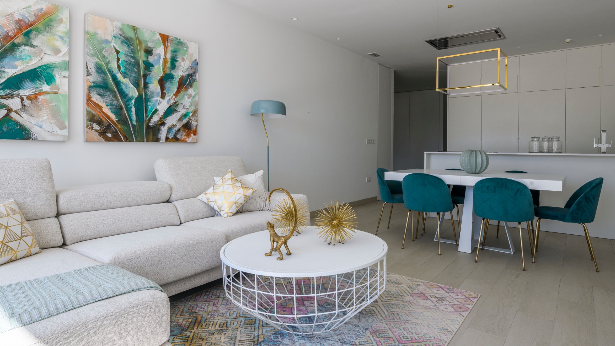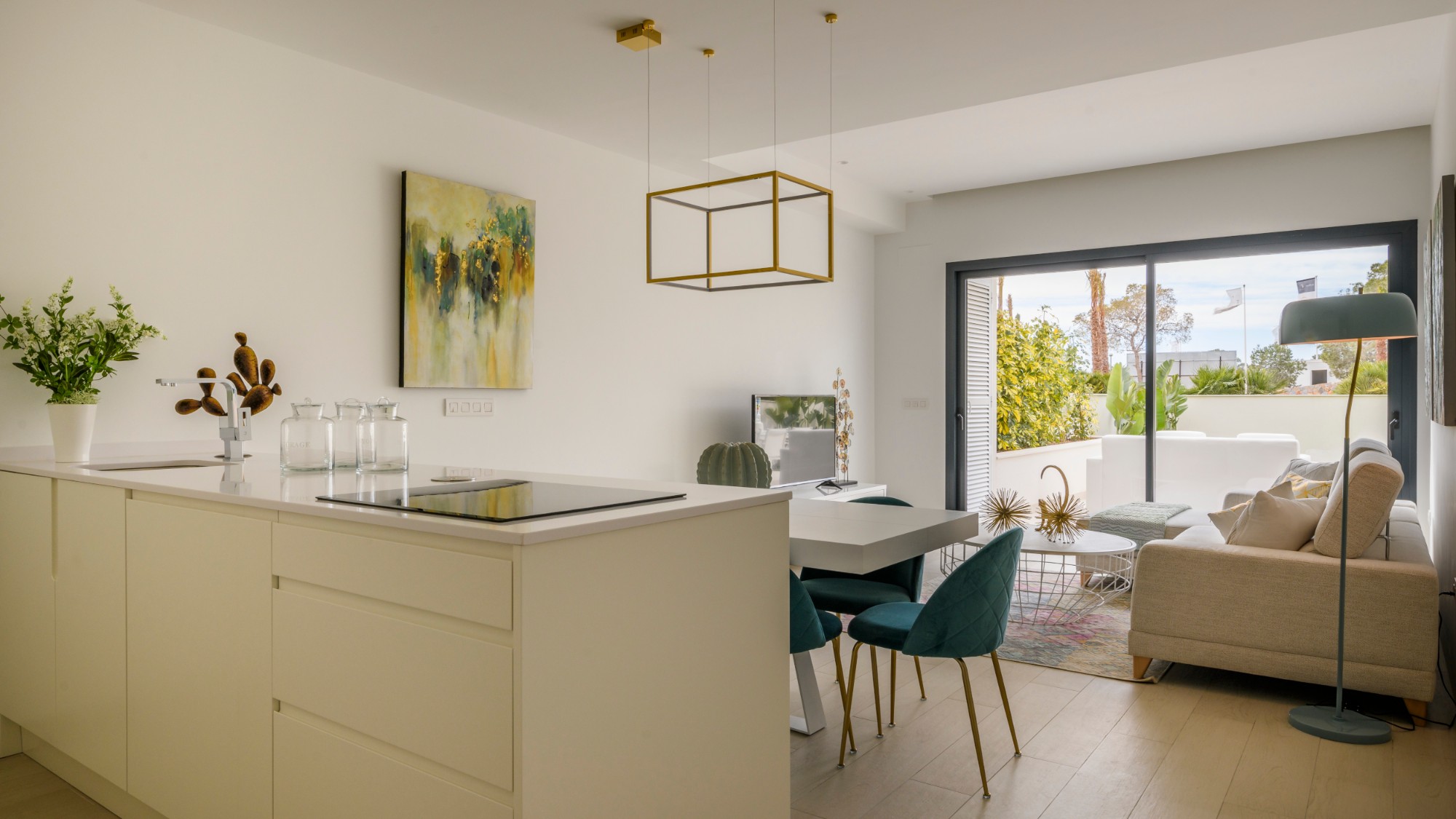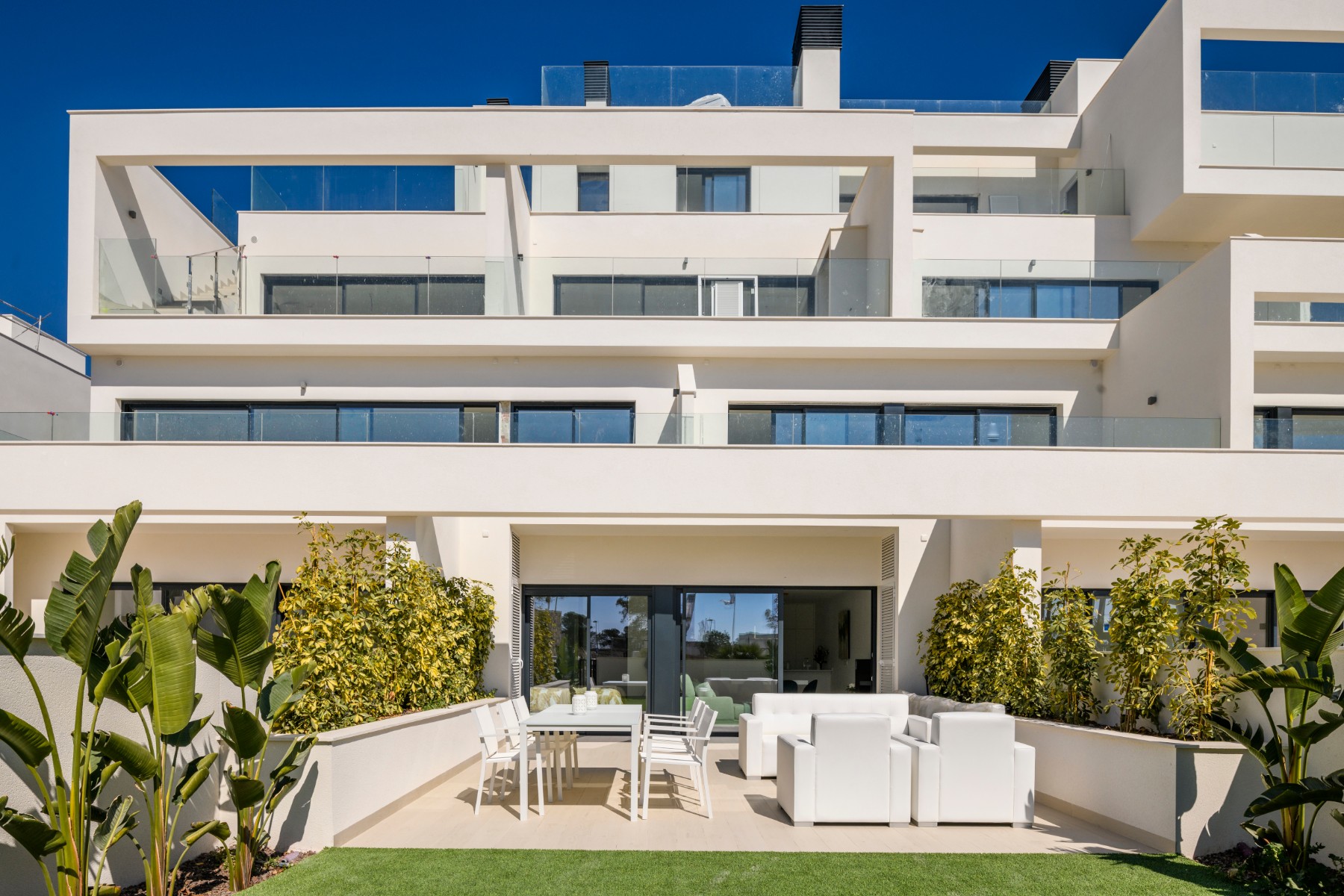 This apartment is finished to the highest standard and includes hot/cold air conditioning, kitchen appliances, inside and outside lighting, lovely communal gardens with palm trees and swimming pool and secure underground parking with storage room.