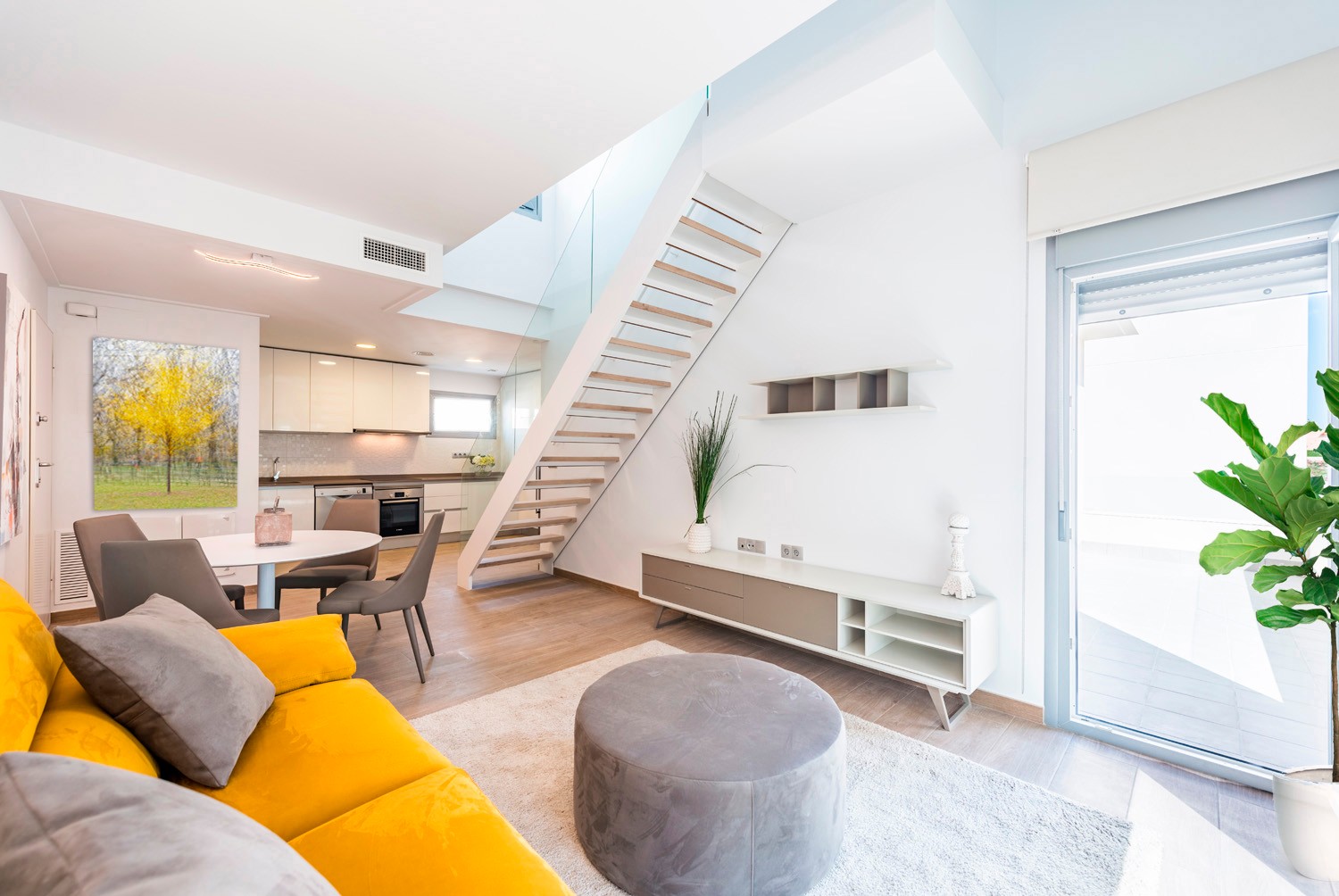 This superb penthouse apartment is finished and ready to move into and includes all furniture, a rooftop solarium, communal gardens with pool, gym and sauna, hot/cold air conditioning, secure parking and a modern kitchen complete with fitted appliances.