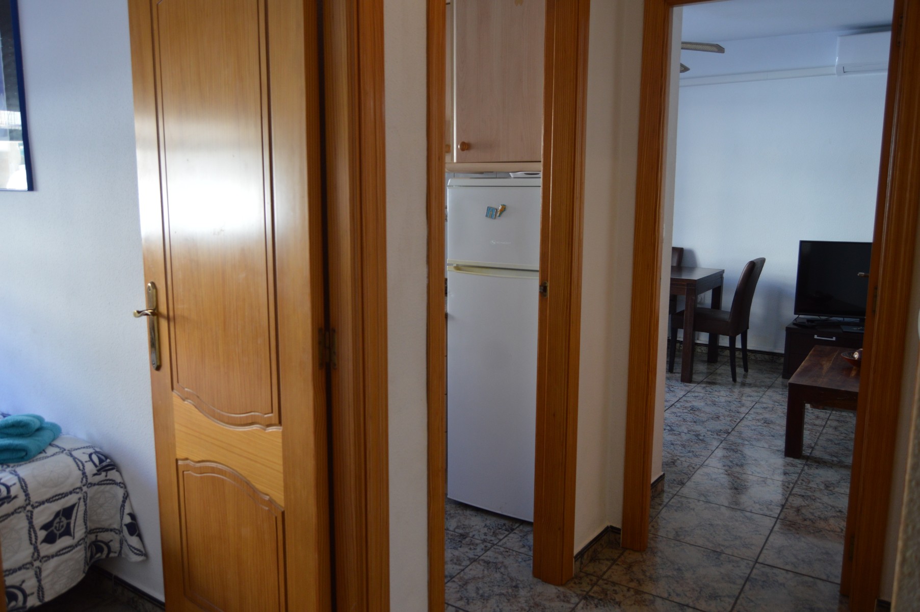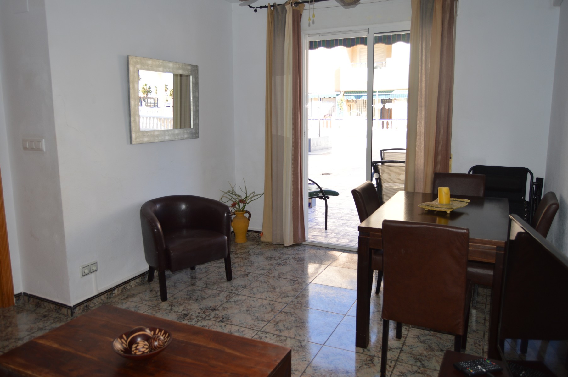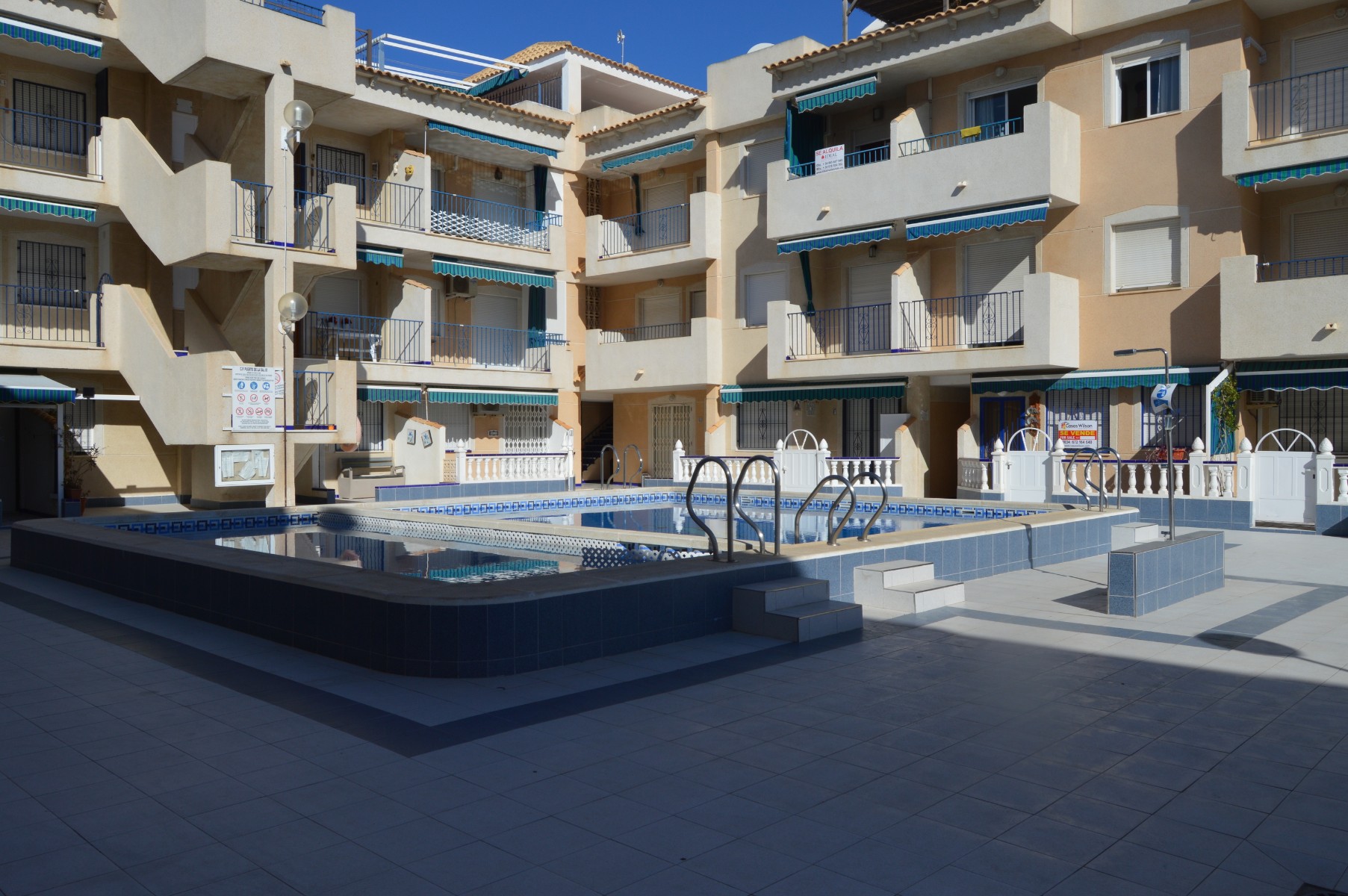 You can access the apartment by the terrace or by the main entrance at the back of the property . The living area is spacious and bright and opens onto the terrace overlooking the pool and the sea. There is also a separate kitchen well fitted off the living area. As you walk trought the hallway passing the living area there is a lovely renovated bathroom and 2 double bedrooms with fitted wardrobres. Off the main bedroom there is a utility/storage room which is great for several uses. The community fees are only €250 per year.