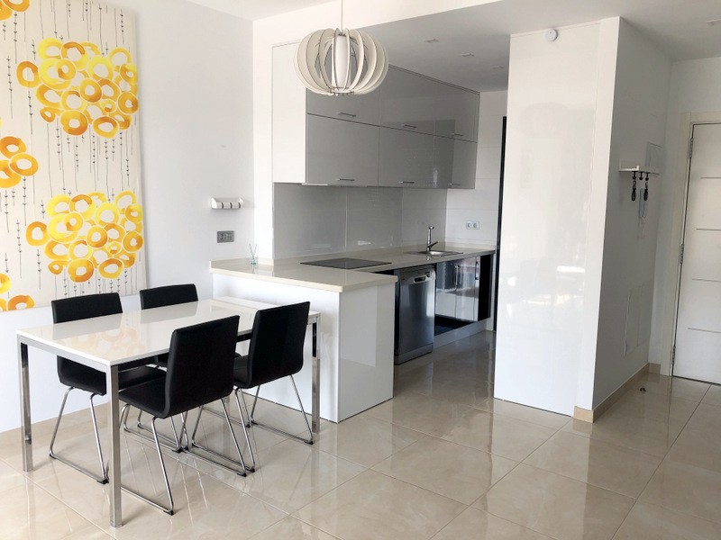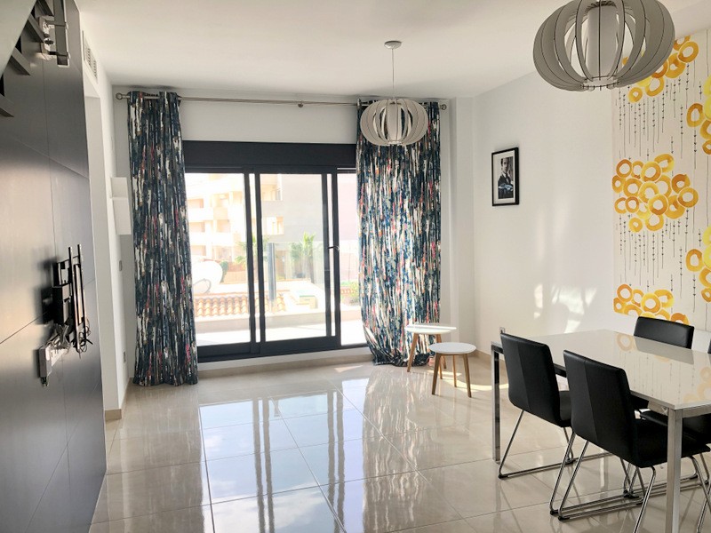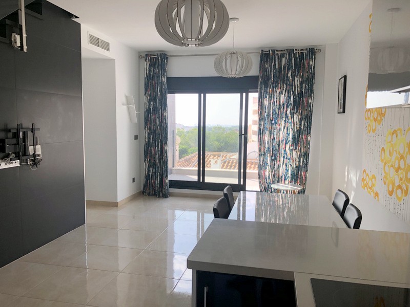 This nearly new apartment is ready to move into and comes part furnished, with fitted hot/cold air conditioning, all lighting, fully fitted kitchen with appliances and complete bathrooms.This 3 bedroom penthouse apartment has a spacious lounge area with patio doors leading out onto the terrace, an open plan modern kitchen with fitted appliances including oven, hob, extractor, fridge/freezer, washing machine, dishwasher and microwave, a dining area, two double bedrooms with fitted wardrobes and a fully fitted guest bathroom. bathroom.
