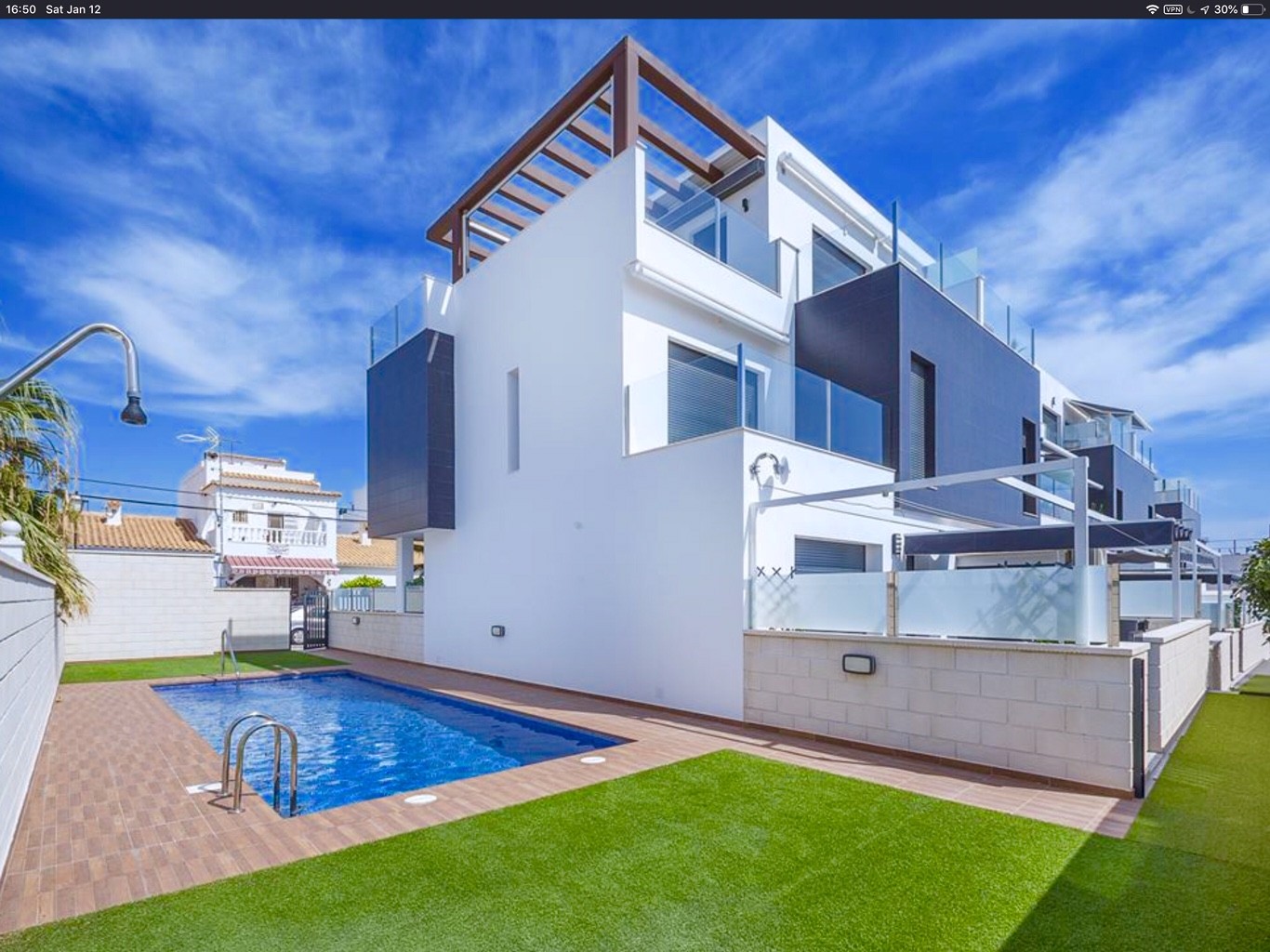 An internal staircase leads up to a master bedroom with fitted wardrobes, en suite and private terrace and on this level you have the large private solarium where you can enjoy sea views and all day sun.The Villamartin area is very popular with tourists and residents, most of the community consists of Western European expatriates who have settled there in the last 15 years, virtually transforming the original village into a vibrant all year round destination. There are also other golf courses nearby and numerous beaches.