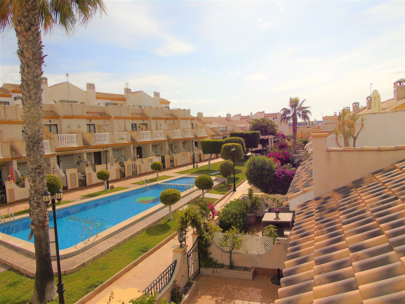 This gated complex offers 2 fantastic communal pools with mature gardens ideal for all year round living.The property itself is only a short stroll to all local amenities and the blue flag award winning beach of Cabo Roig, it is set inside Zenia Golf IV and has direct views of the lovely communal pool from the garden and the terrace. On entry to the Bungalow there is a a large lounge / dining area with an open fireplace and also has a double bedroom with en-suite, to the rear of the lounge. There is a separate kitchen / utility room and storage room. On the upper level you have a master bedroom with en-suite facilities and also access to a large terrace with pool views, you also have the benefit of a small 3rd bedroom.