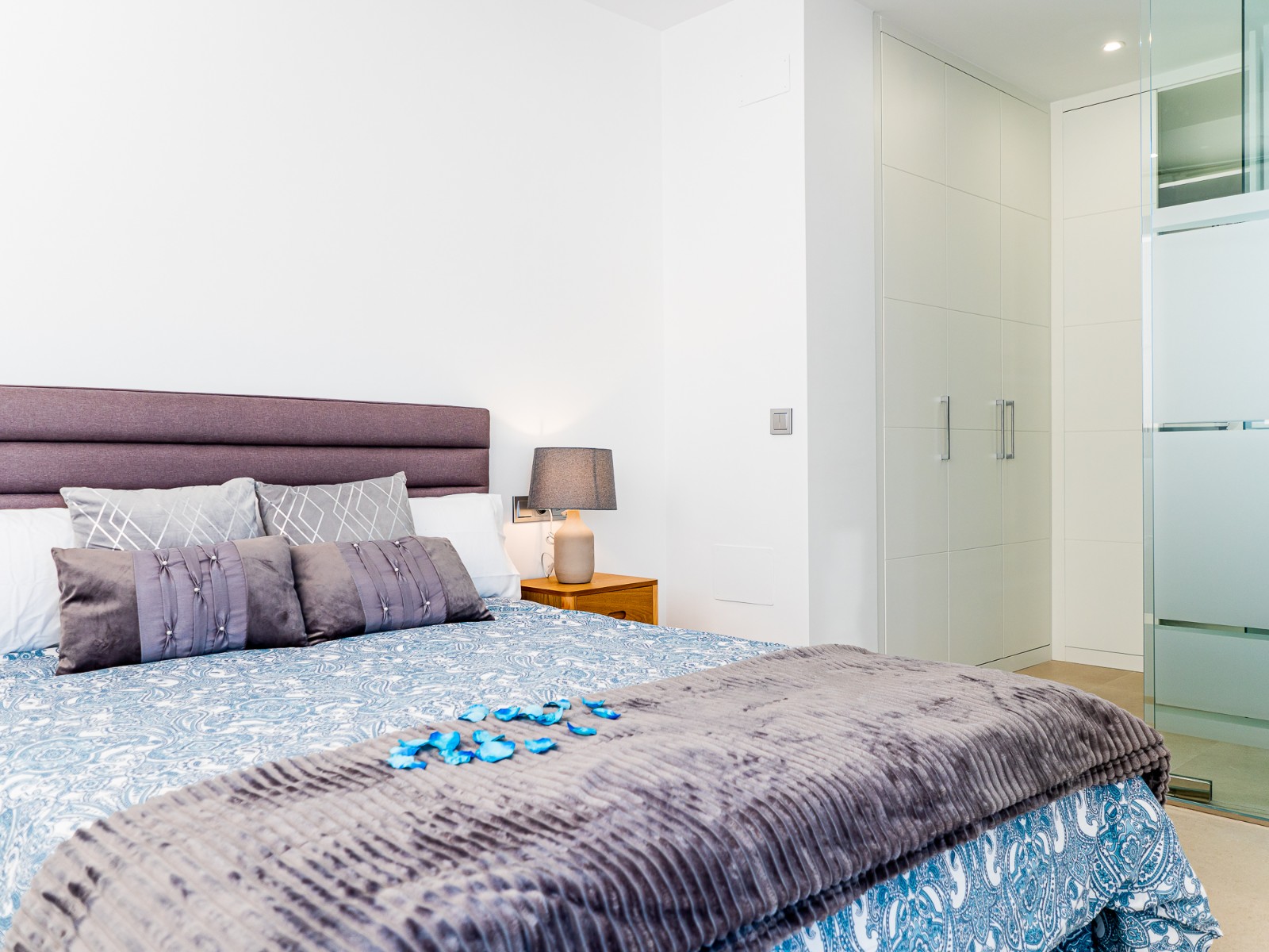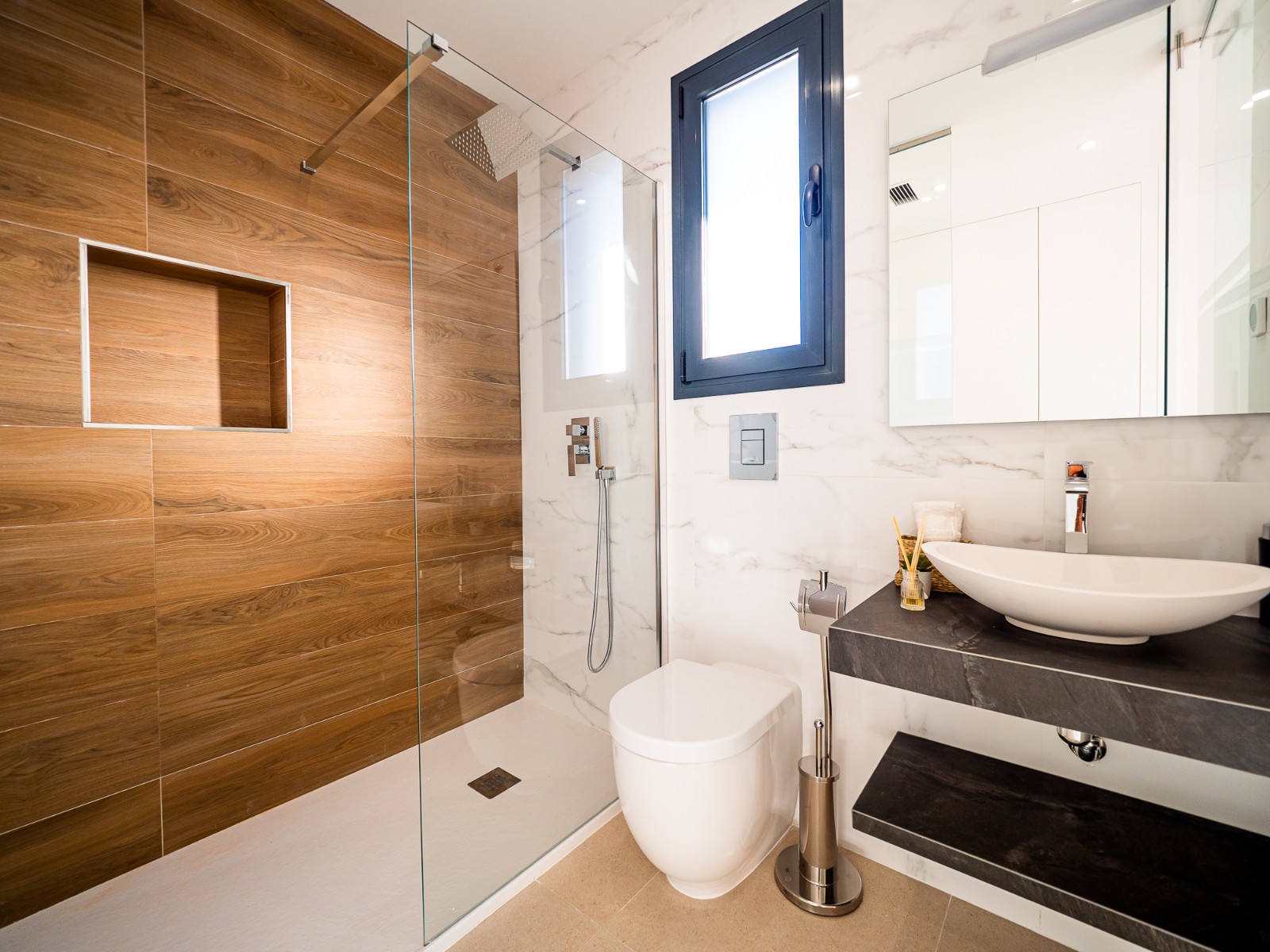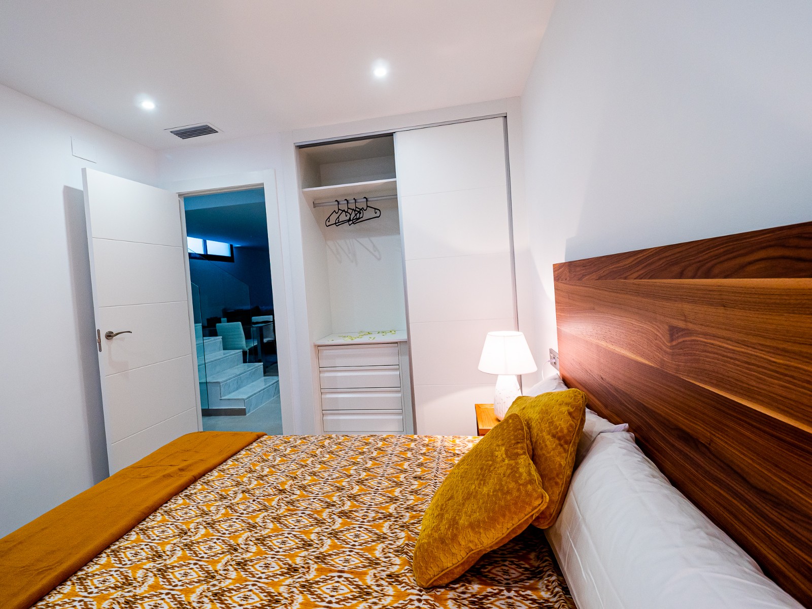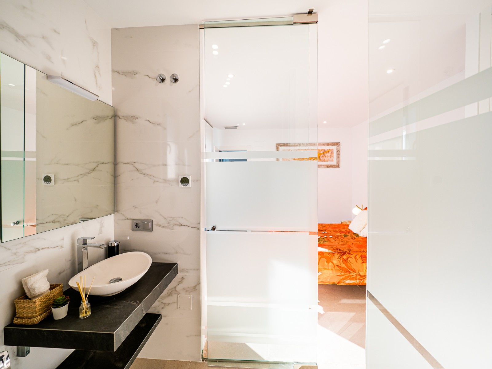 On the first floor there are two further bedrooms with fitted wardrobes and each bedroom has it’s own en-suite bathroom and access to the upper sun terrace.