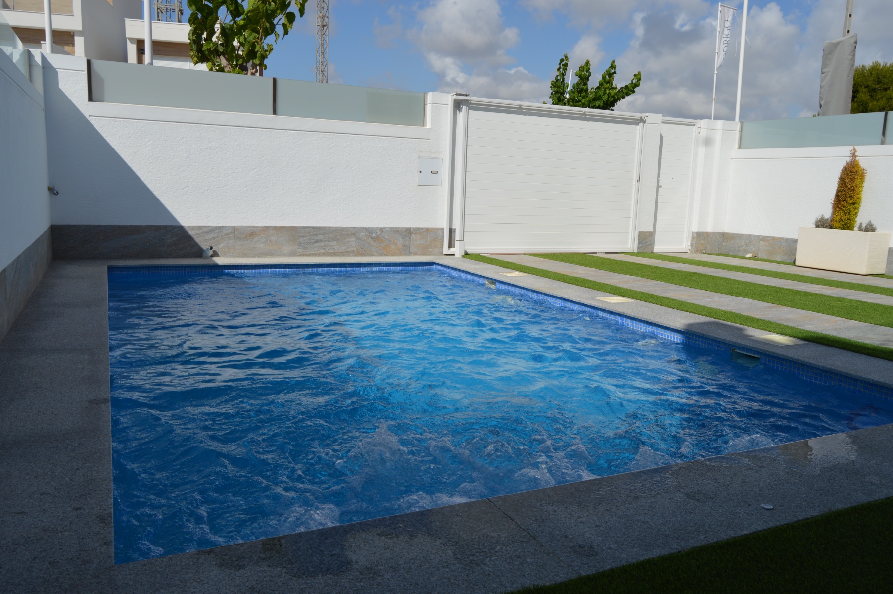 This luxurious modern villa is situated just a few minutes walk from the Pilar de la Horadada town centre and close to the stunning beach in Torre de la Horadada. This property is built to the highest standard and comes with private swimming pool with bench jacuzzi, modern kitchen with fitted appliances and wine cooler, electric shutters and underfloor heating in the bathrooms.