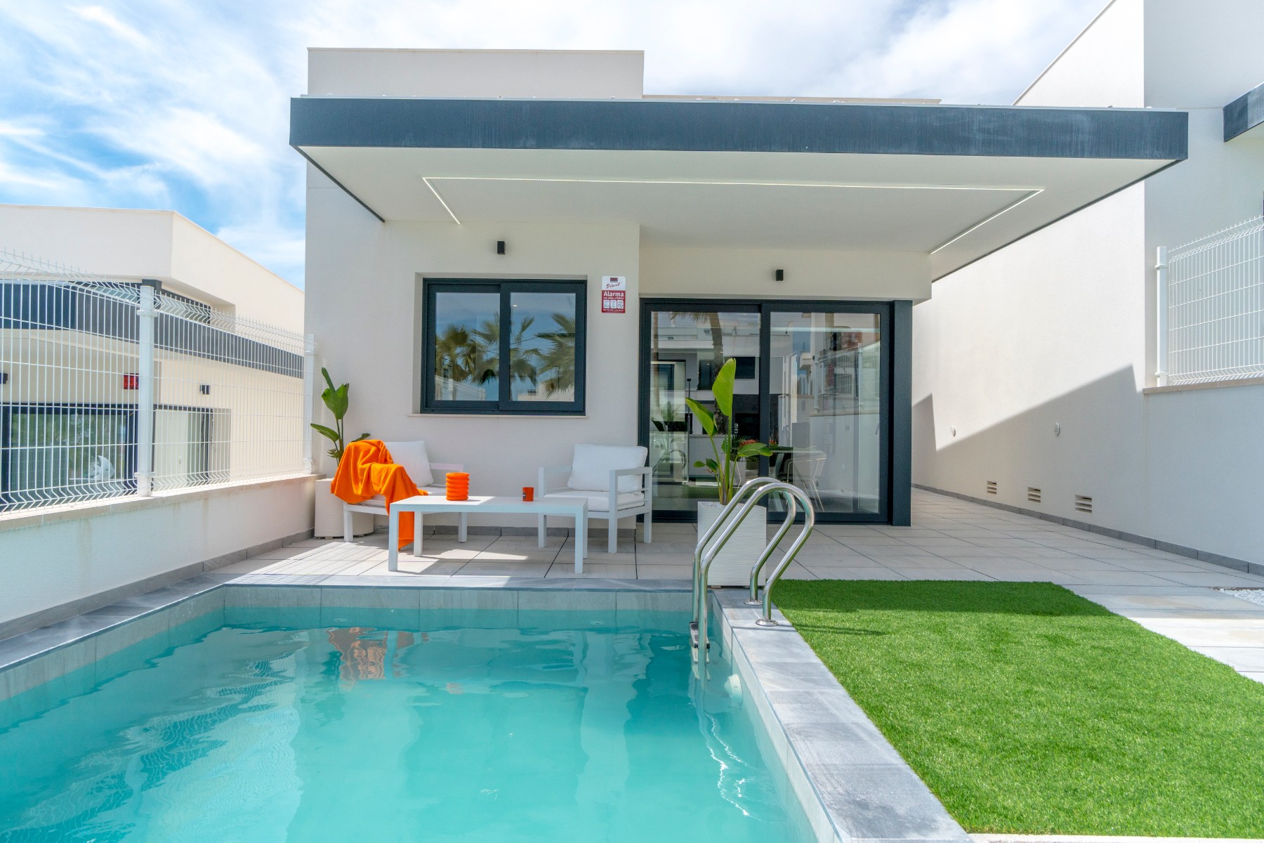 This villa is finished and ready to move into and includes all furniture, hot/cold air conditioning, all lighting, solarium, modern kitchen with fitted appliances, converted under build and a private pool.This luxury villa comprises of a large lounge/dining area with internal atrium and full length patio doors leading out into the garden with swimming pool, an open plan kitchen with fitted appliances including oven, hob, extractor, fridge/freezer, washing machine, dishwasher and microwave, a master bedroom with walk in wardrobe and en-suite, a further double bedroom with fitted wardrobes and en-suite and a guest bathroom.