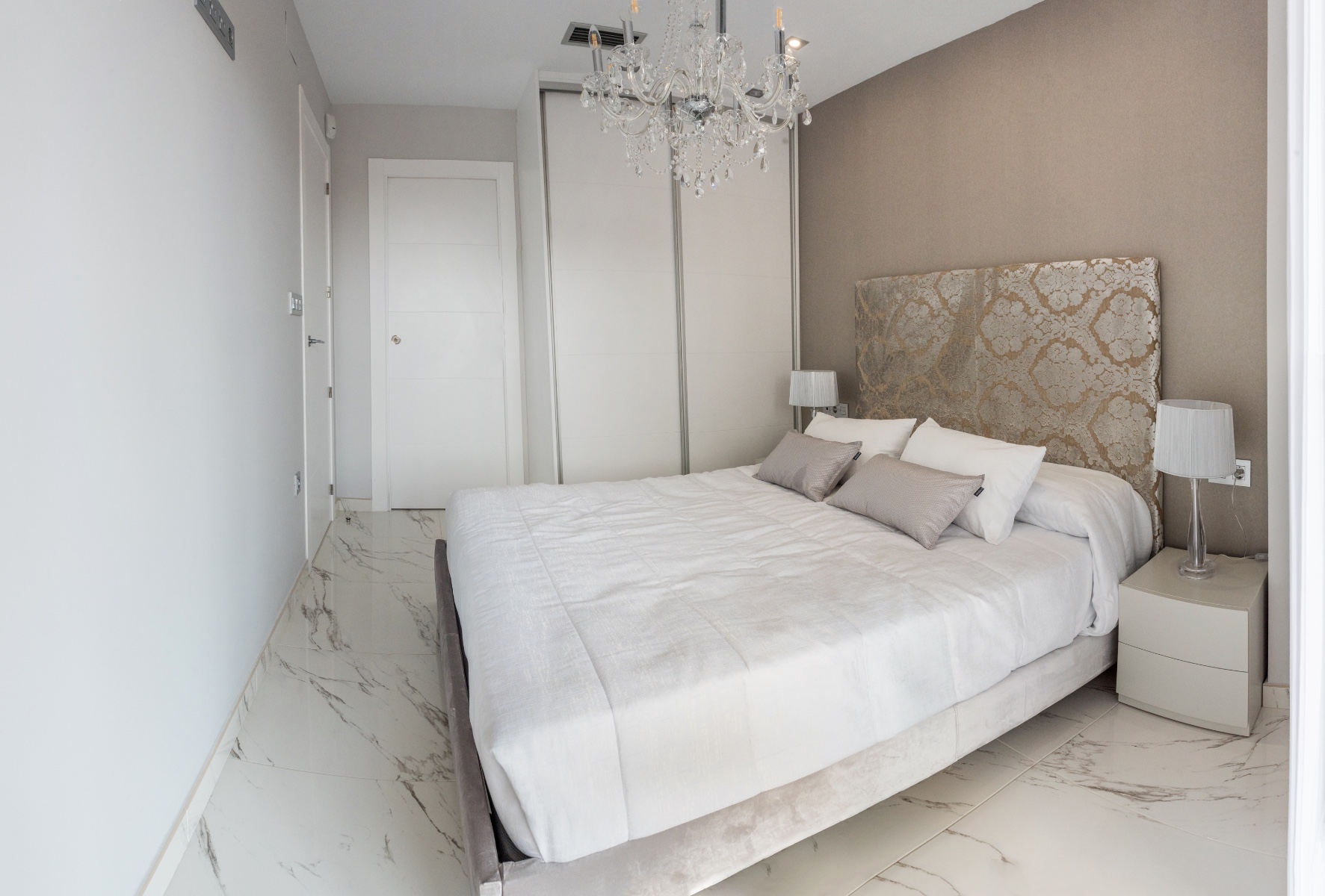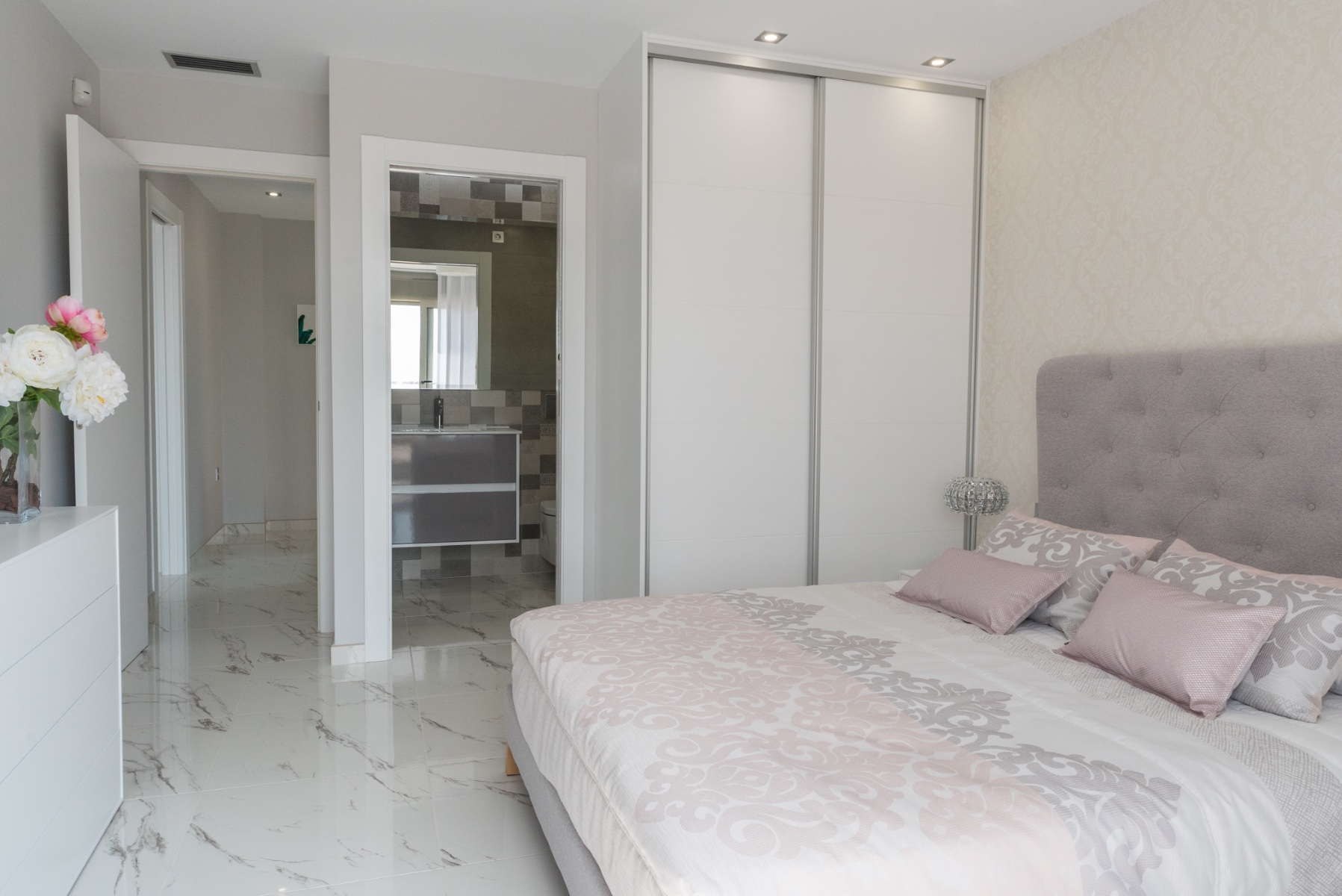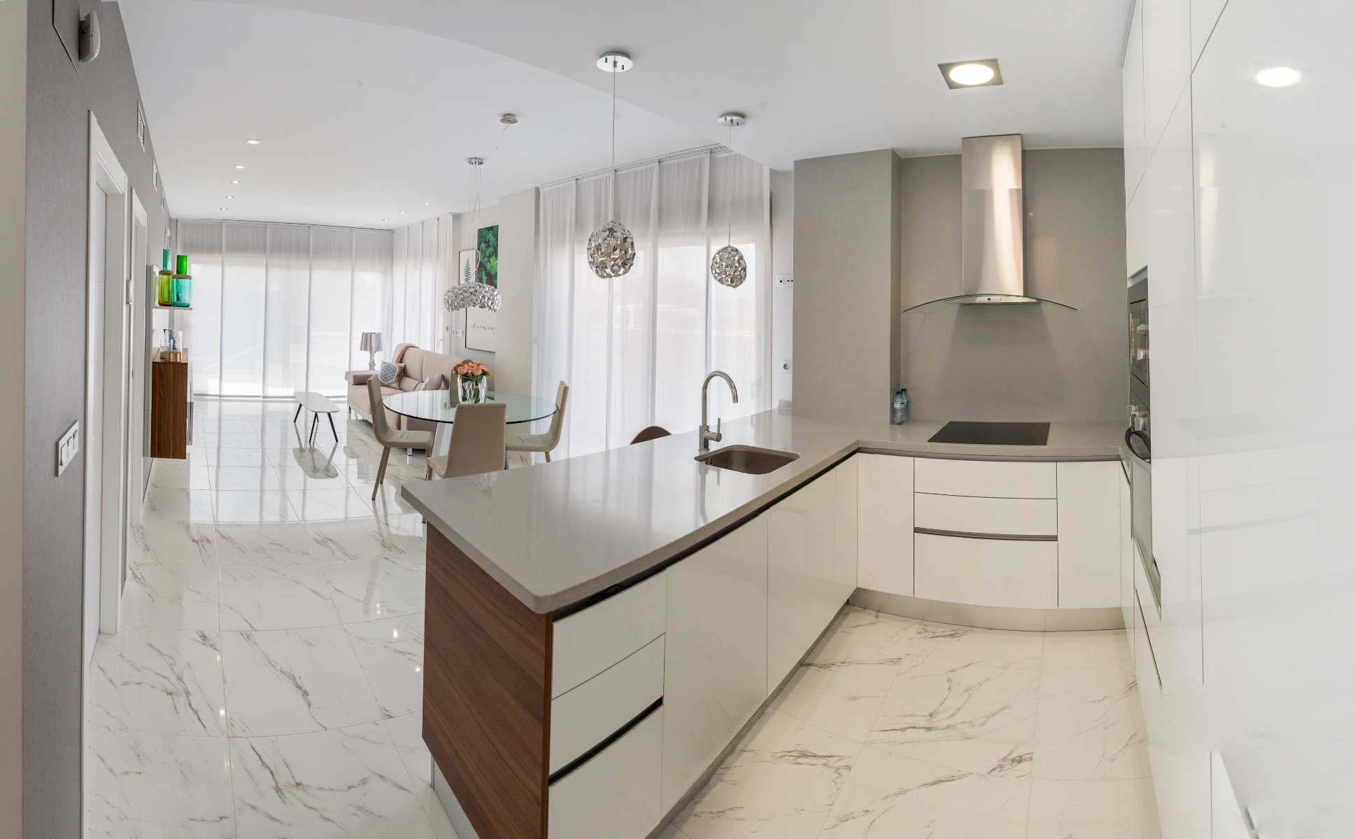 This brand new Showhouse is a 3 bedroom, 3 bathroom detached villa with private pool and is located in the ever popular Villamartin. This stunning villa is ready to move into and includes all furniture, swimming pool, electric shutters throughout, fitted kitchen with appliances, hot/cold air conditioning, all lighting, alarm with internal cameras and private rooftop solarium with artificial grass. The villa is situated only a short walk from bars, restaurants and a large supermarket. The beautiful Blue Flag beaches are only a five minute drive away.This villa consists of a spacious lounge/diner with patio doors leading out into the garden with swimming pool, an open plan modern kitchen with fitted appliances including oven, hob, extractor, fridge/freezer, washing machine, dishwasher and microwave. There is a double bedroom with en suite and fitted wardrobes, storage room and a fully fitted guest bathroom.On the first floor there is a master bedroom with fitted wardrobes, en-suite bathroom and a private terrace, a further double bedroom with fitted wardrobes and it’s own en-suite and an internal staircase which leads up to a private rooftop solarium with artificial grass.