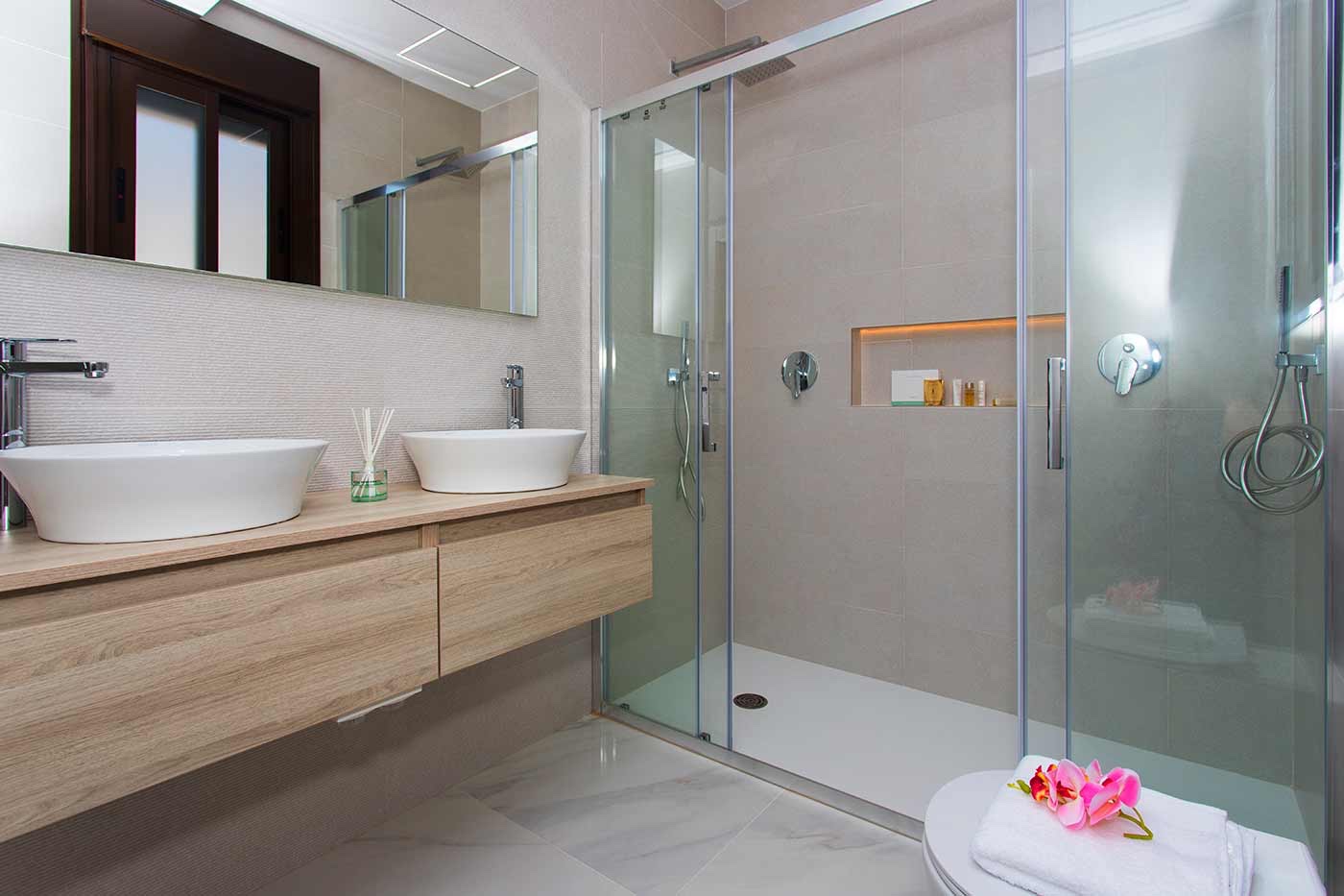 The first floor consists of another double bedroom with fitted wardrobes, a 3rd double bedroom with fitted wardrobes and patio doors from each bedroom lead onto the upper private sun terrace.