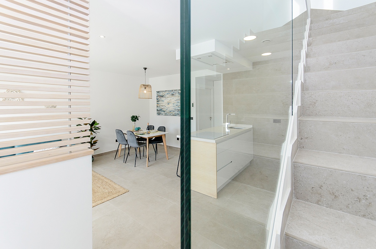 Costa Flamencos Benijofar is a new development of 3 bedroom, 2 bathroom villas on a small plot of 12 properties situated a few minutes walk from the Spanish town of Benijofar which has a host of bars, shops and restaurants. Located in the heart of the charming Spanish town where all the amenities and services are on the doorstep. Benijofar is well connected to the coastal road and Guardamar beaches are less than a ten minute drive away.This showhouse villa is built on the corner plot and includes all furniture, a private pool with bench jacuzzi, hot/cold ducted air conditioning, electric shutters throughout, rooftop solarium, all lighting, modern kitchen with appliances and is ready to move into.The ground floor of this property comprises of a spacious lounge with patio doors which lead out into the garden with private swimming pool and bench jacuzzi, fully fitted modern kitchen, dining area, double bedroom with fitted wardrobes and private rear terrace, guest bathroom complete with shower screen and underfloor heating and a further guest toilet.The first floor consists of a double bedroom with fitted wardrobes and access to a large 20 m² private terrace, a further double bedroom with fitted wardrobes and a guest bathroom complete with shower screen.Benijofar is a bustling Spanish town full of character with a wide range of amenities including banks, shops, bars and restaurants. Quesada is just a few minutes drive away and the blue flag beaches are a short fifteen minute drive.