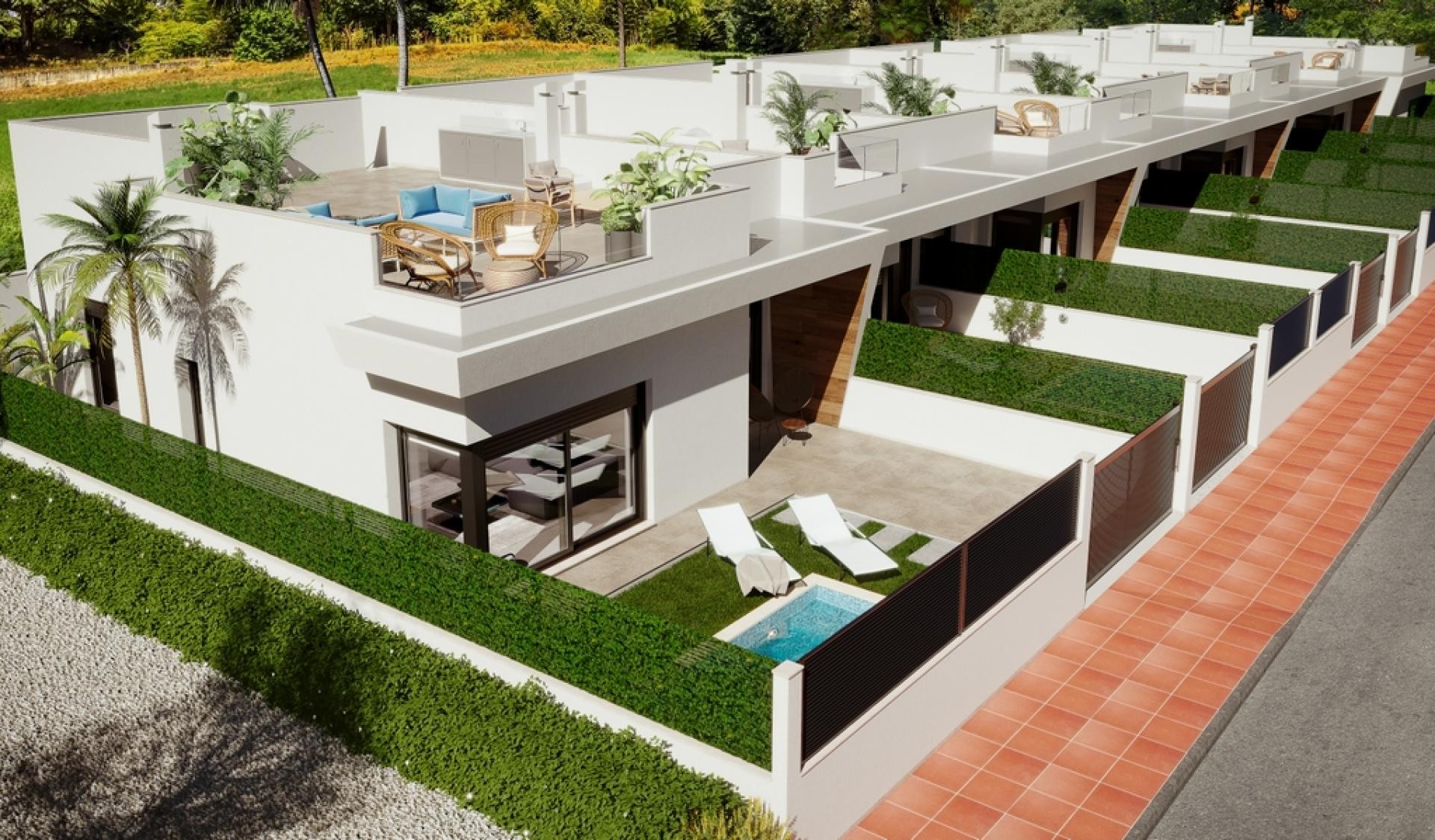 This brand new development of 8 villas has just been released and consists of 2 bedroom, 2 bathroom villas situated on the outskirts of Los Alcazares opposite the Roda golf resort. The villa is in a mature residential area with lovely open countryside views and includes a private pool, off road parking, hot/cold air conditioning, a modern kitchen with fitted appliances, rooftop solarium and an outdoor kitchen.This villa comprises of an open plan lounge with patio doors which lead out into the private garden with swimming pool, an open plan kitchen including oven, hob, extractor, fridge/freezer, dishwasher, washing machine and microwave, a master bedroom with fitted wardrobes and en-suite, a further bedroom with fitted wardrobes and a guest bathroom. Both bedrooms have access to the rear terrace/internal garden where there is a staircase which leads up to a private 65 m² roof solarium which enjoys lovely open views and all day sun.